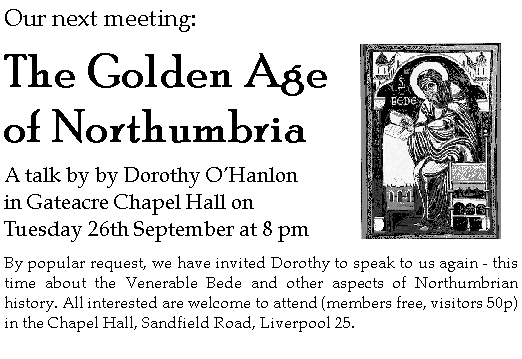 The 26th Annual General Meeting of the Gateacre Society will be held on TUESDAY 31st OCTOBER 2000, starting at 8 p.m., in the Chapel Hall, Sandfield Road. The purpose of the meeting is to receive the Annual Report, approve the Accounts, and elect the Society's Officers and other Committee members for the coming year. Please do your best to attend this important meeting. Nominations for election to the Committee will be accepted on the night, or may be sent in advance to Joan Gadd,